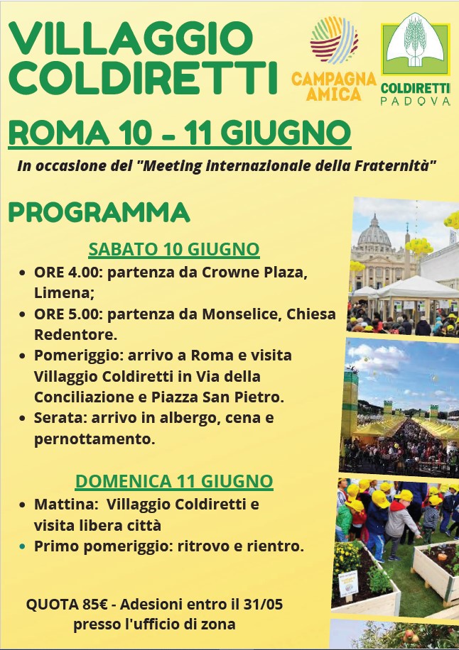 In occasione del "Meeting internazionale della Fraternità" Coldiretti Padova propone due giorni a Roma, sabato 10 e domenica 11 giugno, per la visita al Villaggio Coldiretti allestito in via della Conciliazione e in Piazza San Pietro e l’opportunità di visitare anche la città. Adesioni entro il 31 maggio all’Ufficio di Zona.