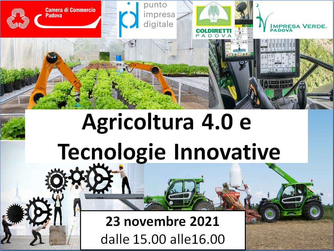 Nuovo appuntamento gratuito on line organizzato da Coldiretti Padova e Impresa Verde Padova con lo scopo di accompagnare le imprese nel processo di digitalizzazione: nell’ambito dello sportello PID (Punto Impresa Digitale), il 23 novembre prossimo è in programma il nuovo webinar dedicato all'agricoltura 4.0 e alle tecnologie innovative, in particolare con gli approfondimenti alla luce dell'ultimo decreto legislativo del 21 ottobre scorso sulla sicurezza nel lavoro. Relatore Domenico Gallimberti, capo settore certificazioni aziendali di Coldiretti Padova. Per partecipare inviare una mail a: massimiliano.citton@coldiretti.it