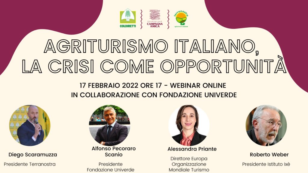 Al via una serie di webinar di Coldiretti dedicati alle aziende agricole, alle aziende agrituristiche e a tutte quelle aziende che fanno della multifunzionalità il proprio punto di forza. Il primo appuntamento, dedicato al tema “Agriturismo italiano, la crisi come opportunità”, è in programma per giovedì 17 febbraio alle ore 17. Si parte dunque dall'agriturismo, con un incontro che che vuole tracciare le linee guida di una ripresa necessaria per il nostro turismo in campagna .