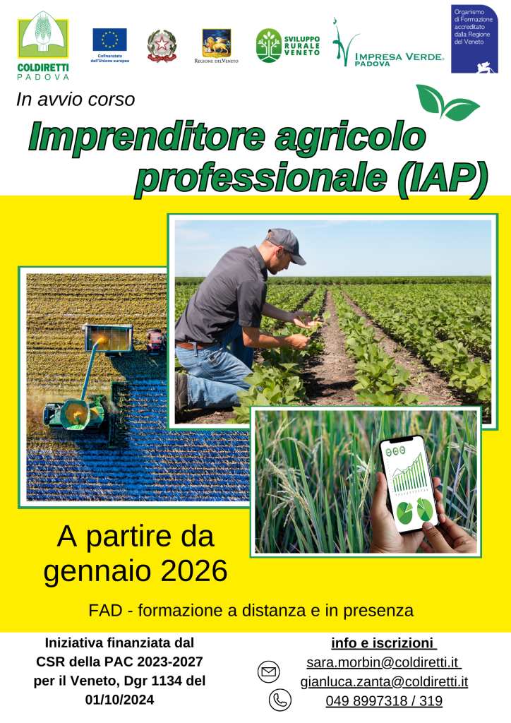 Impresa Verde Padova srl, organismo di formazione accreditato dalla Regione Veneto, comunica l'apertura delle iscrizioni per il nuovo corso dedicato all'acquisizione della qualifica di Imprenditore Agricolo Professionale (IAP). Il percorso formativo, che avrà inizio a partire da gennaio 2026, è specificamente progettato per chi si insedia per la prima volta nel settore primario o per chi acquisisce proprietà agricole e necessita della qualifica professionale prevista dalla normativa.