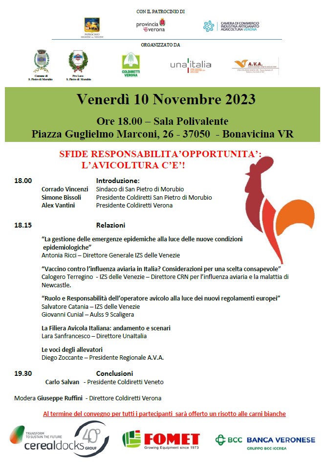 "Sfide, responsabilità e opportunità: l'avicoltura c'è". Questo il titolo del convegno organizzato per venerdì 10 novembre a Bonavicina, in provincia di Verona, a partire dalle 18 nella sala polivalente di Piazza Guglielmo Marconi. In primo piano la gestione delle emergenze epidemiche, il vaccino contro l'influenza aviaria, il ruolo e responsabilità dell'operatore avicolo, la situazione dell'avicoltura italiana e le posizioni degli allevatori. Di seguito il programma dell'incontro, per adesioni contattare i nostri Uffici territoriali.