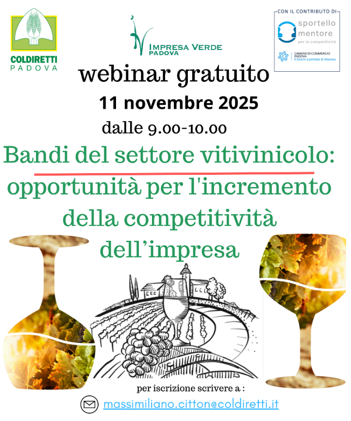 “Bandi del settore vitivinicolo: opportunità per l'incremento della competitività dell’impresa”: questo il titolo del webinar gratuito di martedì 11 novembre dalle 9 alle 10 su iniziativa di Coldiretti Impresa Verde Padova nell'ambito del Progetto Mentore promosso dalla Camera di Commercio di Padova. Relatore: Filippo Scapoli, Area tecnica - Responsabile settore Vitivinicolo - Sede Provinciale Impresa Verde Padova Srl. I bandi del settore vitivinicolo rappresentano un’importante leva di crescita per le imprese del comparto. Attraverso contributi e agevolazioni, favoriscono l’innovazione tecnologica, la sostenibilità ambientale e l’ampliamento dei mercati, sostenendo così l’incremento della competitività e la valorizzazione delle produzioni vitivinicole