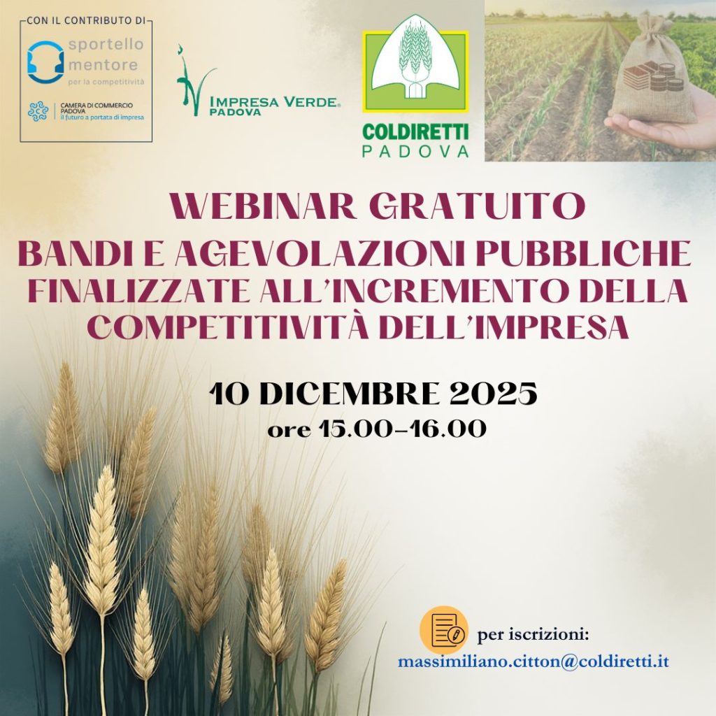 Coldiretti Padova e Impresa Verde Padova, in collaborazione con lo Sportello Mentore della Camera di Commercio di Padova, organizzano un webinar gratuito focalizzato sui finanziamenti e gli aggiornamenti per le aziende agricole.