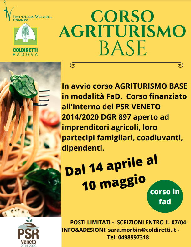 E’ in avvio il corso Agriturismo base (50 ore) gratuito per Imprenditori agricoli, partecipi famigliari, dipendenti agricoli e coadiuvanti. Il corso è finanziato all’interno del Psr Veneto 2014/2020 DGR 897 e verrà svolto in modalità FaD (formazione a distanza) attraverso la piattaforma Google Meet; durante le lezioni sarà obbligatorio mantenere sempre accesa la webcam/fotocamera del dispositivo che si utilizzerà per seguire il corso.