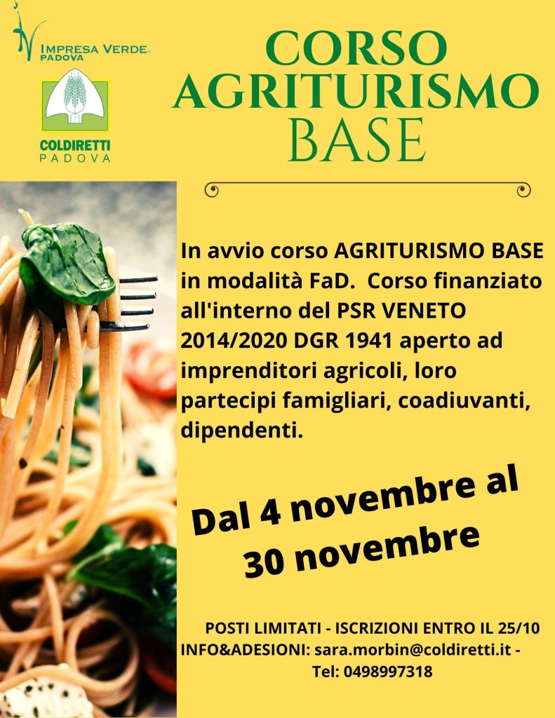 Al via il corso Agriturismo base in modalità formazione a distanza (FaD), quindi interamente on line, organizzato dall’Ufficio Formazione di Coldiretti Impresa Verde Padova dal 4 al 30 novembre. I posti sono limitati e le iscrizioni vanno confermate entro il 25 ottobre prossimo. Si tratta di un corso finanziato all'interno del PSR VENETO2014/2020 DGR 1941 aperto ad imprenditori agricoli, loro partecipi famigliari, coadiuvanti e dipendenti.