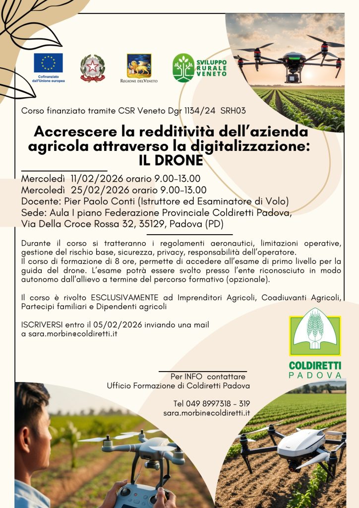 È in avvio il corso finanziato dal CSR Veneto "Accrescere la redditività dell'azienda agricola attraverso la digitalizzazione: IL DRONE". Il percorso di 8 ore, tenuto dall'istruttore e esaminatore di volo Pier Paolo Conti, tratterà regolamenti aeronautici, gestione del rischio, privacy e sicurezza, permettendo l'accesso all'esame di primo livello per la guida del drone. L'attività è riservata esclusivamente a imprenditori agricoli, coadiuvanti, partecipi familiari e dipendenti. Le lezioni si terranno l'11 e il 25 febbraio 2026 dalle ore 9:00 alle 13:00 presso la sede di Coldiretti Padova in Via Della Croce Rossa 32. Le iscrizioni devono pervenire entro il 5 febbraio 2026 inviando una mail a sara.morbin@coldiretti.it oppure contattando l'ufficio formazione ai numeri 049 8997318 o 319.