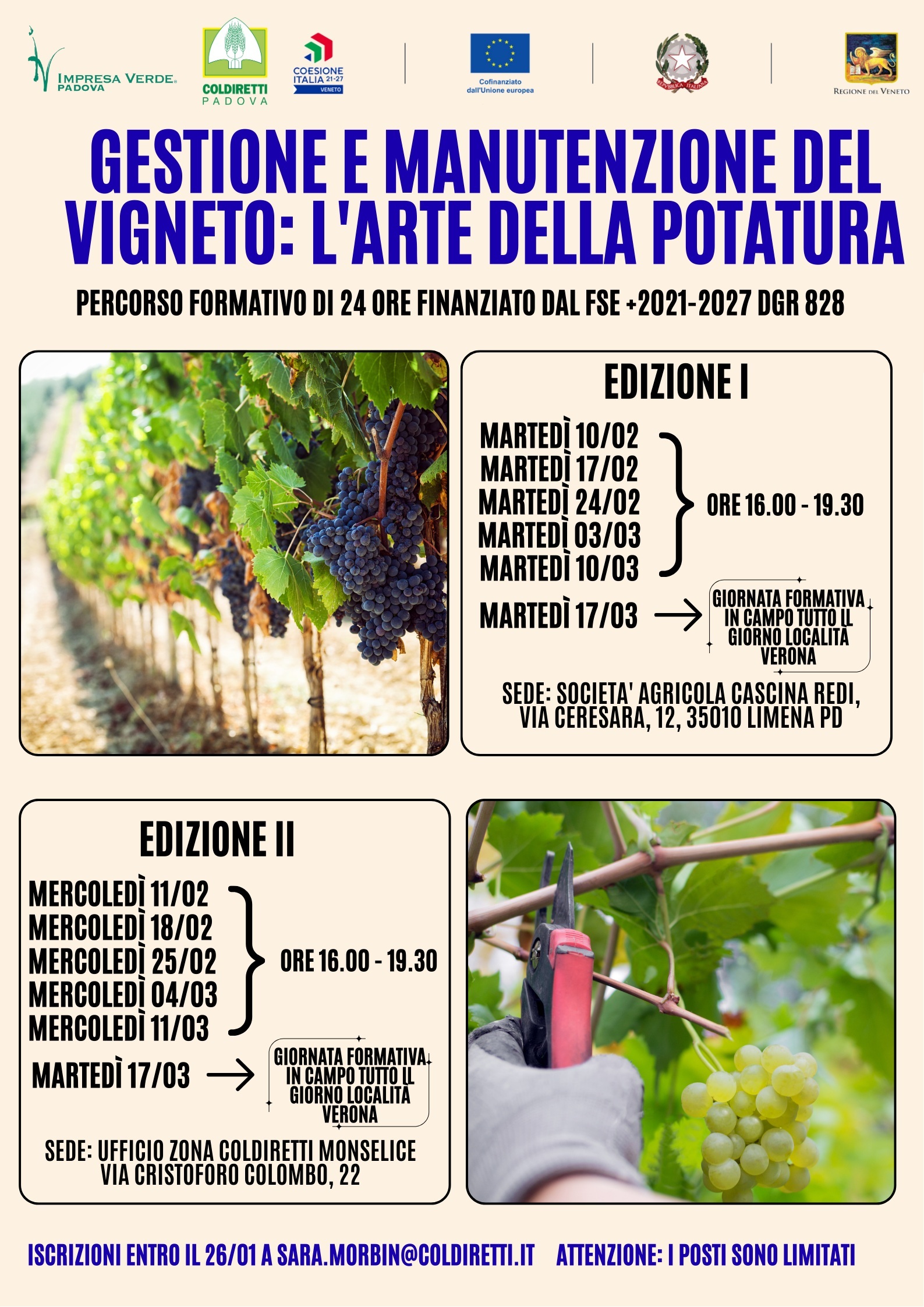 Impresa Verde Padova organizza il corso di 24 ore "Gestione e manutenzione del vigneto: l'arte della potatura" finanziato dal FSE+ 2021-2027 DGR 828. Il percorso è rivolto a titolari di partita IVA agricola, partecipi, dipendenti e coadiuvanti e approfondirà temi quali morfologia, fisiologia della vite, criteri di potatura, qualità del taglio e sicurezza. Sono previste due edizioni: a Limena presso la Società Agricola Cascina Redi dal 10 febbraio e a Monselice presso l'Ufficio Zona Coldiretti dall'11 febbraio, con una giornata formativa finale in campo a Verona il 17 marzo. Le iscrizioni chiudono il 26 gennaio, salvo esaurimento posti. Per informazioni e iscrizioni è possibile contattare Sara Morbin alla mail sara.morbin@coldiretti.it o al numero 049 8997318.