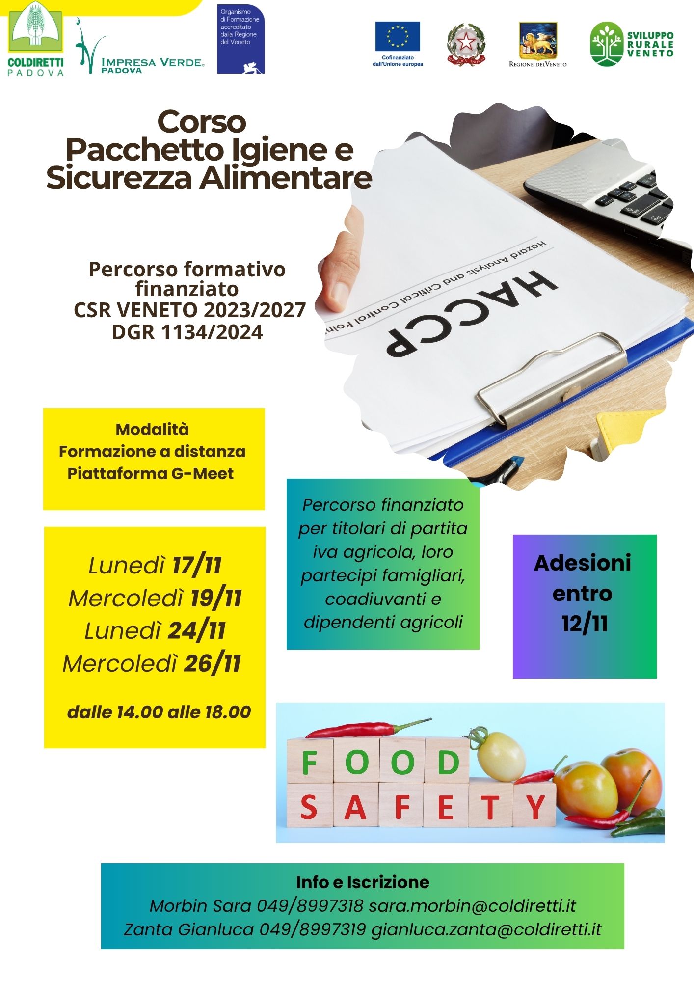 Impresa Verde Padova, quale organismo di formazione accreditato dalla Regione Veneto, organizza per il mese di novembre un corso Pacchetto igiene e sicurezza alimentare 16 ore, on line. Il corso è finanziato dal CSR VENETO 2023-2027 e possono parteciparvi esclusivamente titolari di P.IVA agricola, loro partecipi famigliari, coadiuvanti e dipendenti agricoli. Iscrizioni entro il 12 novembre all'Ufficio Formazione. Tutti i dettagli nella locandina qui sotto.