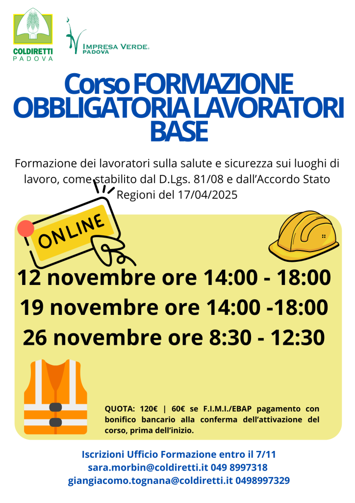 Sono disponibili gli ultimi posti per il corso Formazione obbligatoria lavoratori base, rischio medio, per assolvere agli obblighi di legge da parte delle aziende con dipendenti. Iscrizioni all'Ufficio Formazione di Coldiretti Impresa Verde Padova.