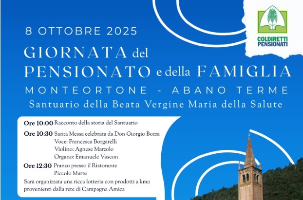 Centinaia di agricoltori senior si danno appuntamento mercoledì 8 ottobre 2025 a Monteortone di Abano Terme (PD) per celebrare la Giornata Provinciale del Pensionato e della Famiglia Coldiretti. L'annuale appuntamento, promosso da Coldiretti Senior Padova, si svolgerà presso il suggestivo Santuario della Beata Vergine Maria della Salute e sarà un’occasione di festa, riflessione e rivendicazione sul ruolo cruciale dei senior nella famiglia, nella società e nel mondo agricolo.