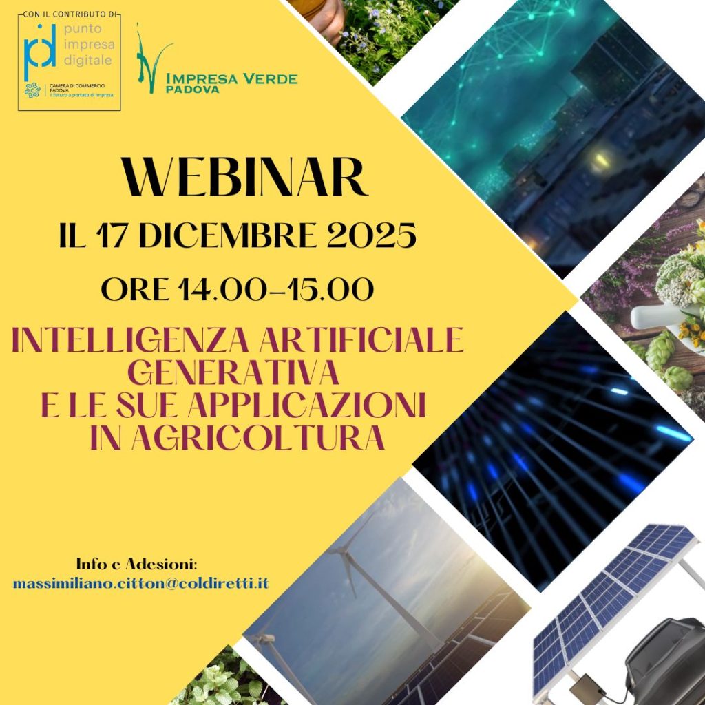 “Intelligenza artificiale generativa e le sue applicazioni in agricoltura”, per saperne di più un appuntamento da non perdere. Mercoledì 17 dicembre 2025, dalle ore 14:00 alle ore 15:00, si terrà il webinar gratuito promosso da Coldiretti Padova e Impresa Verde Padova nell'ambito del progetto PID (Punto Impresa Digitale) della Camera di Commercio di Padova.