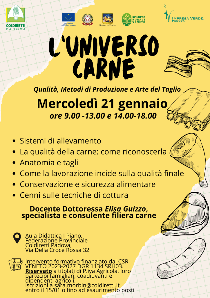 Impresa Verde Padova, organismo di formazione accreditato dalla Regione Veneto, organizza una giornata formativa finanziata dal CSR Veneto 2023-2027 dal titolo L’Universo Carne: Qualità, Metodi di Produzione e Arte del Taglio. L'appuntamento è fissato per mercoledì 21 gennaio 2026, dalle ore 9.00 alle 13.00 e dalle 14.00 alle 18.00, presso l'aula didattica al primo piano della Federazione Provinciale Coldiretti Padova, in via Della Croce Rossa 32 a Padova.