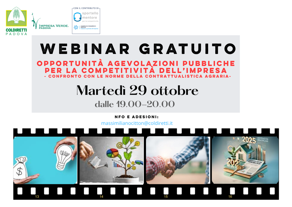 E' in programma il prossimo 29 ottobre dalle ore 19 alle 20 il webinar gratuito su "Opportunità e agevolazioni pubbliche per la competitività dell'impresa. Confronto con le norme della contrattualistica agraria" organizzato da Coldiretti Impresa Verde Padova nell'ambito dello sportello Mentore della Camera di Commercio di Padova.