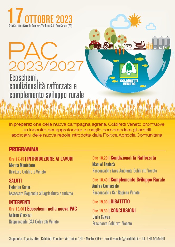 In preparazione della nuova campagna agraria, Coldiretti Veneto promuove un incontro per approfondire e meglio comprendere gli ambiti applicativi delle nuove regole introdotte dalla Politica Agricola Comunitaria. Appuntamento martedì 17 ottobre a Due Carrare, Sala dei Carraresi (via Roma, 33) alle ore 17.45 per approfondire i dettagli della “Pac 2023-2027: ecoschemi, condizionalità rafforzata e complemento sviluppo rurale”. Dopo l’introduzione di Marina Montedoro, direttore di Coldiretti Veneto e il saluto di Federico Caner, assessore regionale all’agricoltura e al turismo, gli interventi di Andrea Vincenzi, responsabile Caa Coldiretti Veneto, sugli ecoschemi della nuova Pac; Manuel Benincà, responsabile area ambiente Coldiretti Venetom, sulla condizionalità rafforzata; Andrea Comacchio, responsabile Csr Regione Veneto, sul complemento sviluppo rurale. Dopo il dibattito le conclusioni sono affidate a Carlo Salvan, presidente di Coldiretti Veneto.