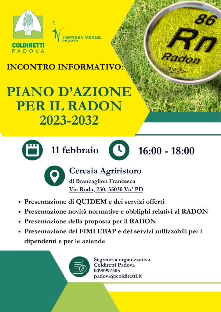 Coldiretti Padova e Impresa Verde Padova invitano i soci a partecipare all'incontro informativo dedicato al Piano d’Azione per il Radon 2023-2032, che si terrà il prossimo 11 febbraio dalle ore 16:00 alle 18:00 presso il Ceresia Agriristoro (Via Roda 230, Vo' PD).