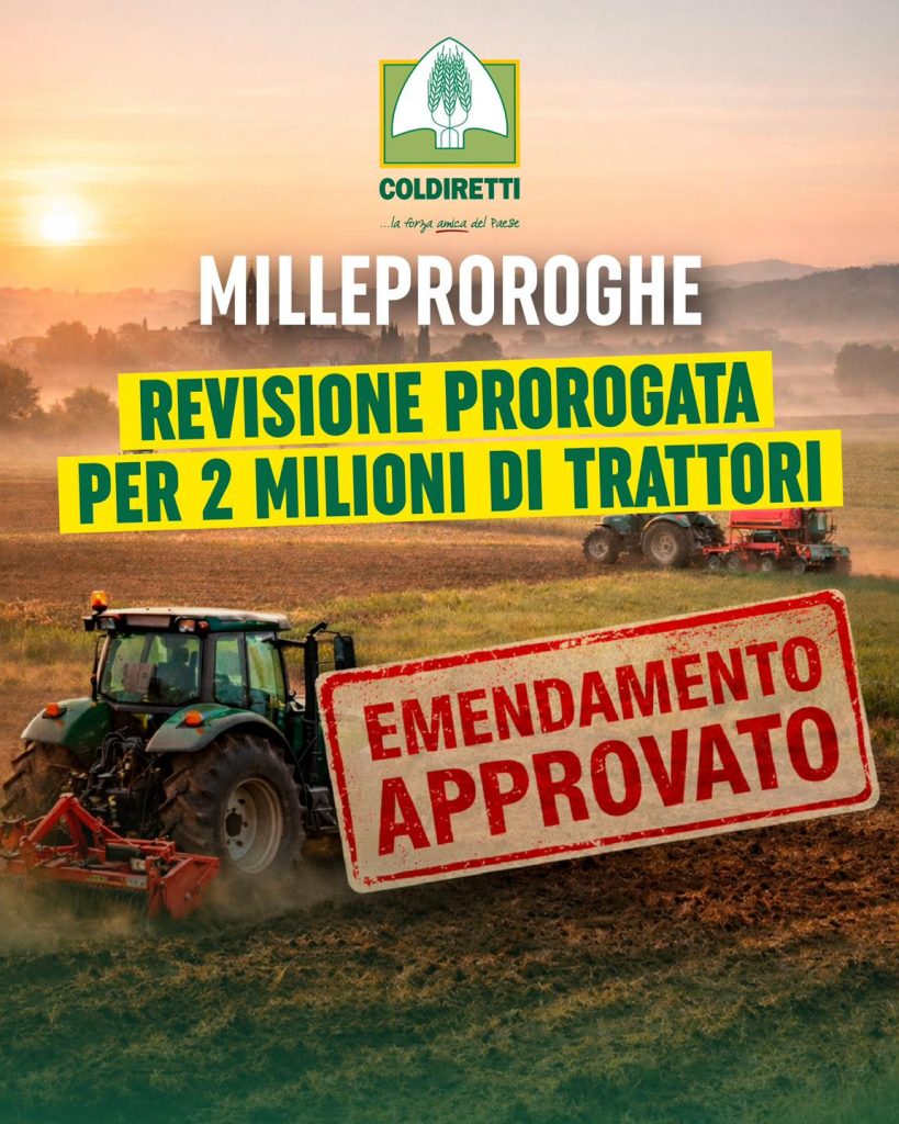 La proroga dei termini per la revisione delle macchine agricole approvata nell’ambito del decreto Milleproroghe interessa di fatto circa 2 milioni di trattori e come più volte auspicato da Coldiretti rappresenta un passo necessario per garantire sicurezza reale nelle campagne e certezza operativa alle imprese. È quanto afferma Coldiretti nel sottolineare il valore dell’emendamento approvato nelle Commissioni riunite Affari costituzionali e Bilancio della Camera, presentato a prima firma dal presidente della Commissione Agricoltura On. Mirco Carloni, che consente di riallineare tempi e strumenti, garantendo coerenza tra gli obiettivi di sicurezza e le condizioni reali in cui operano le imprese.