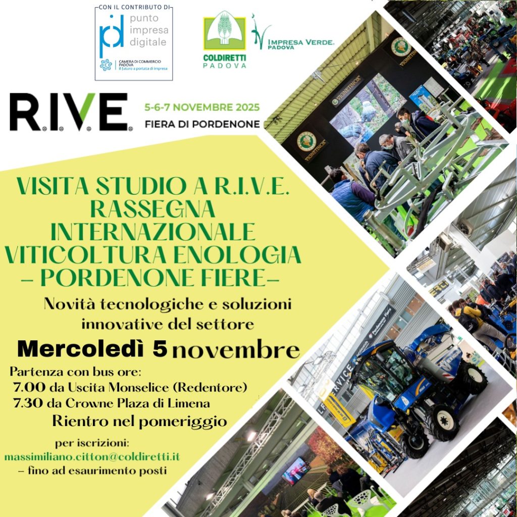 Coldiretti Impresa Verde Padova organizza una visita studio, in giornata, a Pordenone Fiere in occasione di “RIVE - Rassegna Internazionale Viticoltura Enologia- Innovazione in Viticoltura”, il prossimo 5 novembre, nell’ambito del progetto Pid Punto Impresa Digitale della Camera di Commercio di Padova. Partenza in bus da Monselice (ore 7) e Limena Crowne Plaza (ore 7.30). Per adesioni, fino ad esaurimento posti, inviare una mail a massimiliano.citton@coldiretti.it.