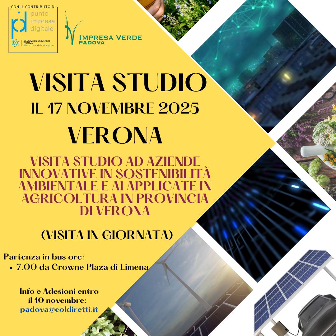E’ in programma il 7 novembre la “Visita studio ad aziende innovative in sostenibilità ambientale e AI applicate in agricoltura in provincia di Verona” promossa da Coldiretti Impresa Verde Padova nell’ambito del progetto Pid Punto Impresa Digitale della Camera di Commercio di Padova. Partenza in bus ore 7 da Limena Crowne Plaza, rientro in giornata. Per info e adesioni mail: padova@coldiretti.it Tel. 0498997305.