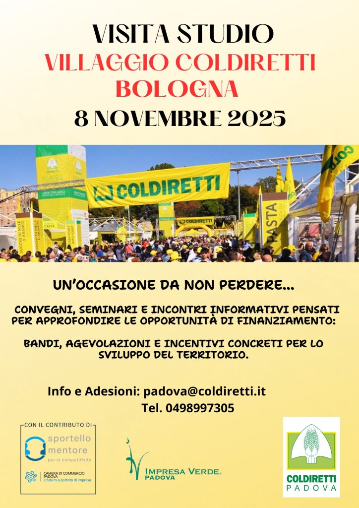 Coldiretti Impresa Verde Padova organizza una visita studio, in giornata, a Bologna, sabato 8 novembre, in occasione del Villaggio Coldiretti, nell’ambito del progetto Mentore della Camera di Commercio di Padova, con la possibilità di partecipare a convegni, seminari, incontri formativi per approfondire le opportunità di finanziamento, i bandi, le agevolazioni e gli incentivi concreti per lo sviluppo del territorio. Per info e adesioni mail padova@coldiretti.it Tel. 0498997305.